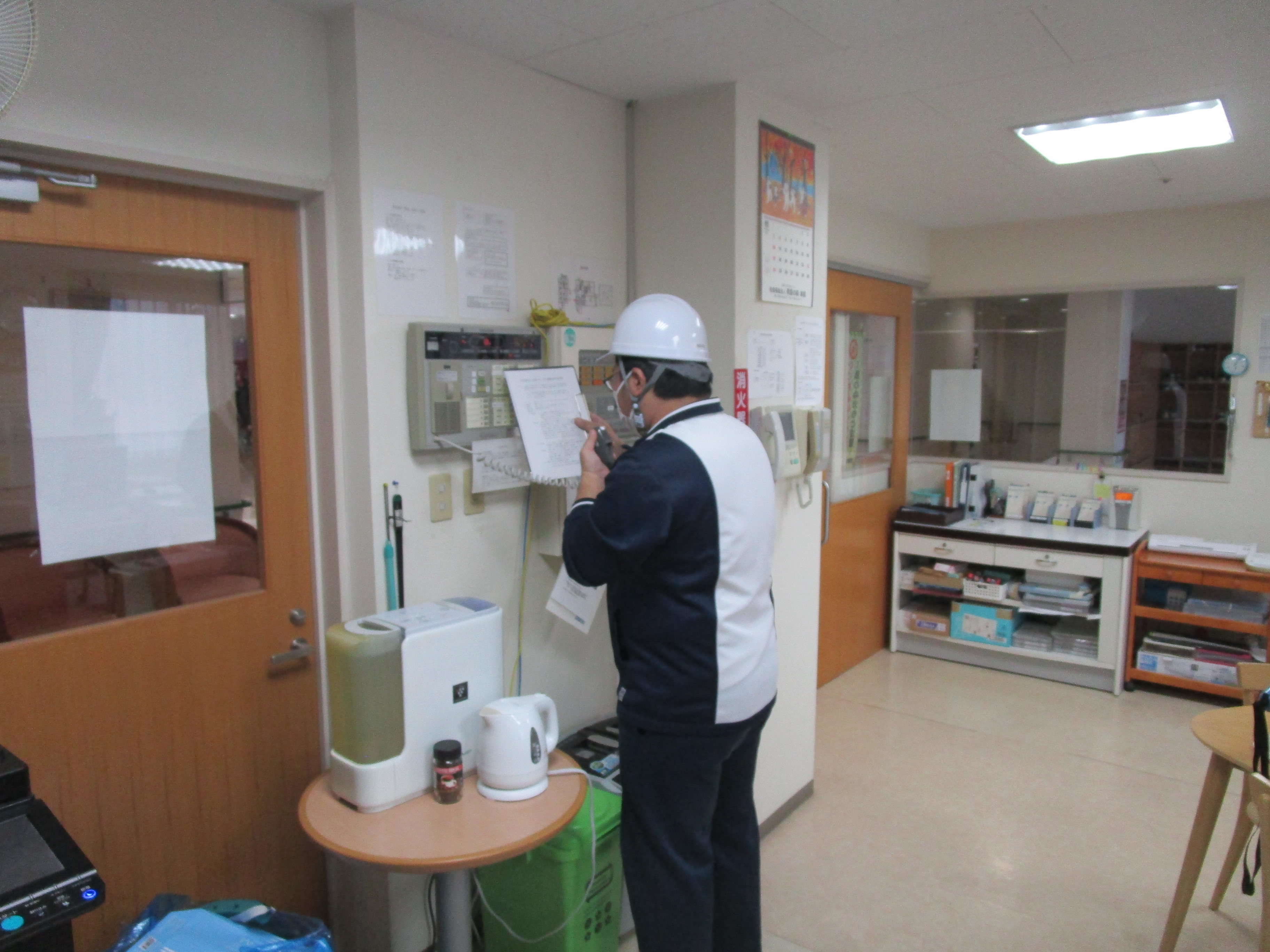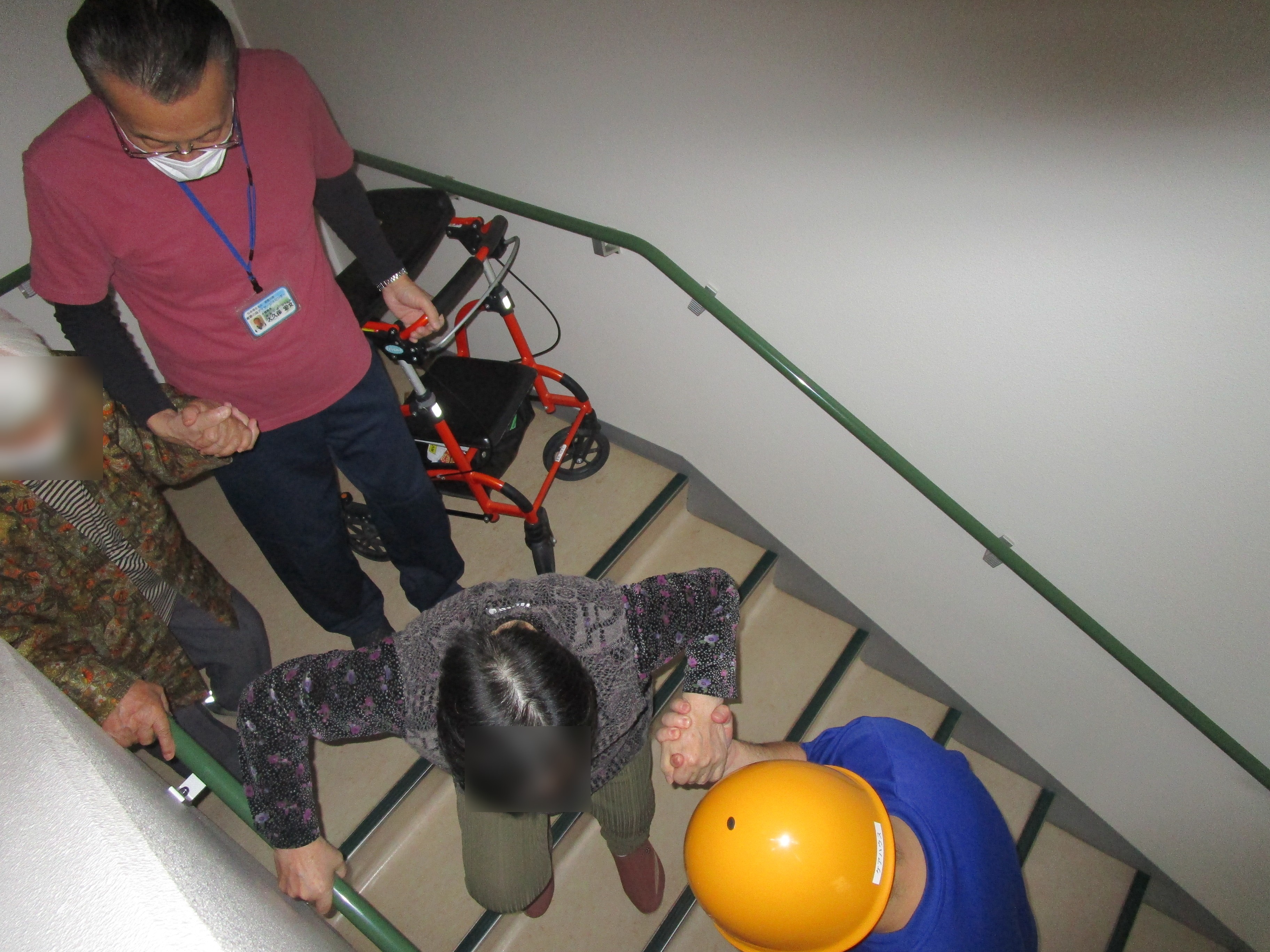 大地震の発生と、直後の火災発生を想定して、防災避難訓練を実施しました。地震の直後は慌てずにその場で身を守ることが大切です。その後で火災が発生したという想定で、職員の誘導による避難が始まりました。階段を下りる方への介助は、介護職員の技術が必要です。訓練を重ね、利用者の皆様の安全確保に努めます。
